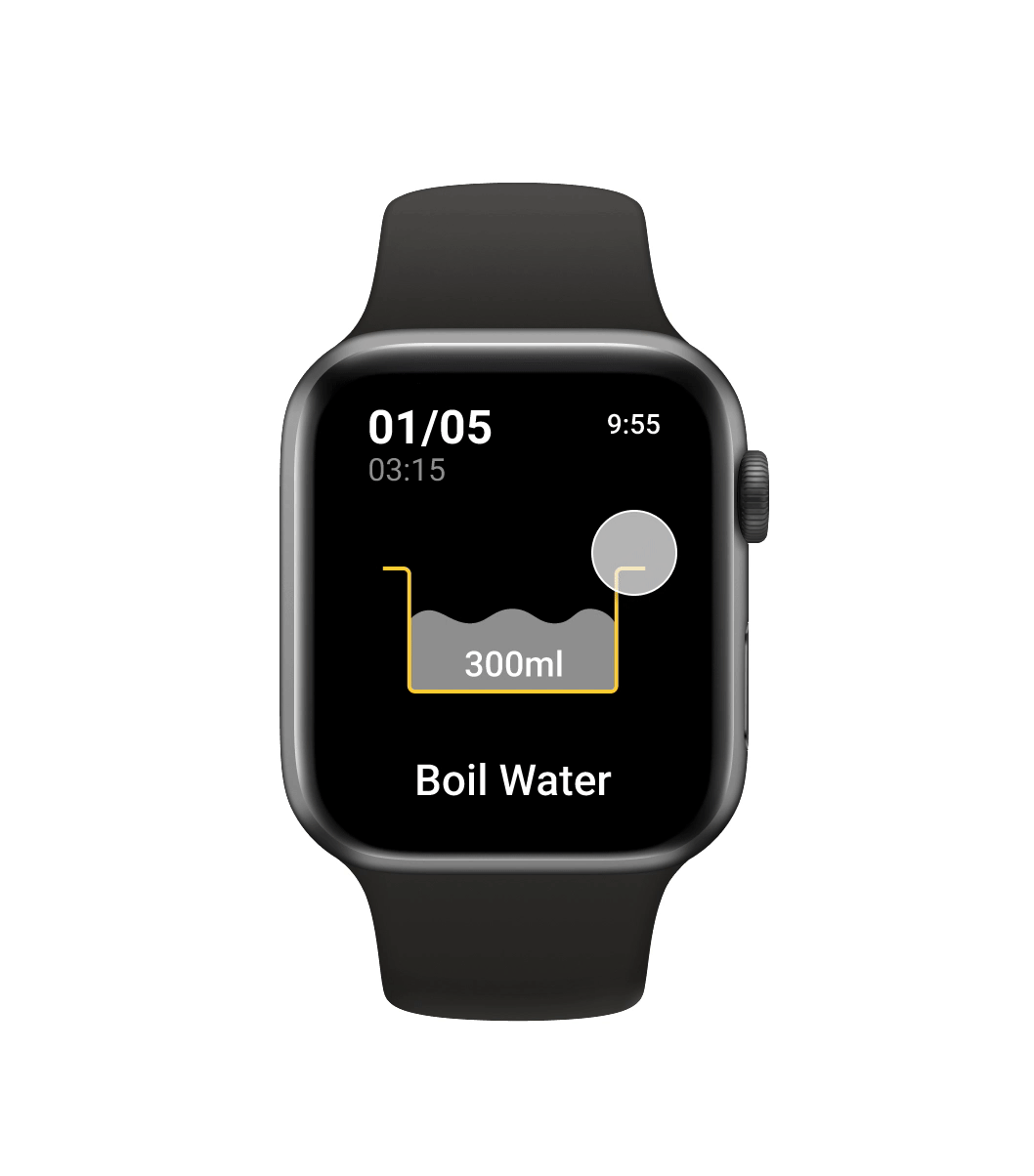 Use simple patterns to show each cooking step, and users can also jump directly to the next step reminder by shaking the wrist twice. When they need to pause during cooking, they can long-press the watch screen. Make every step of cooking can be flexibly controlled by users, release their hands, focus more on cooking, make the process clearer and reduce mistakes.